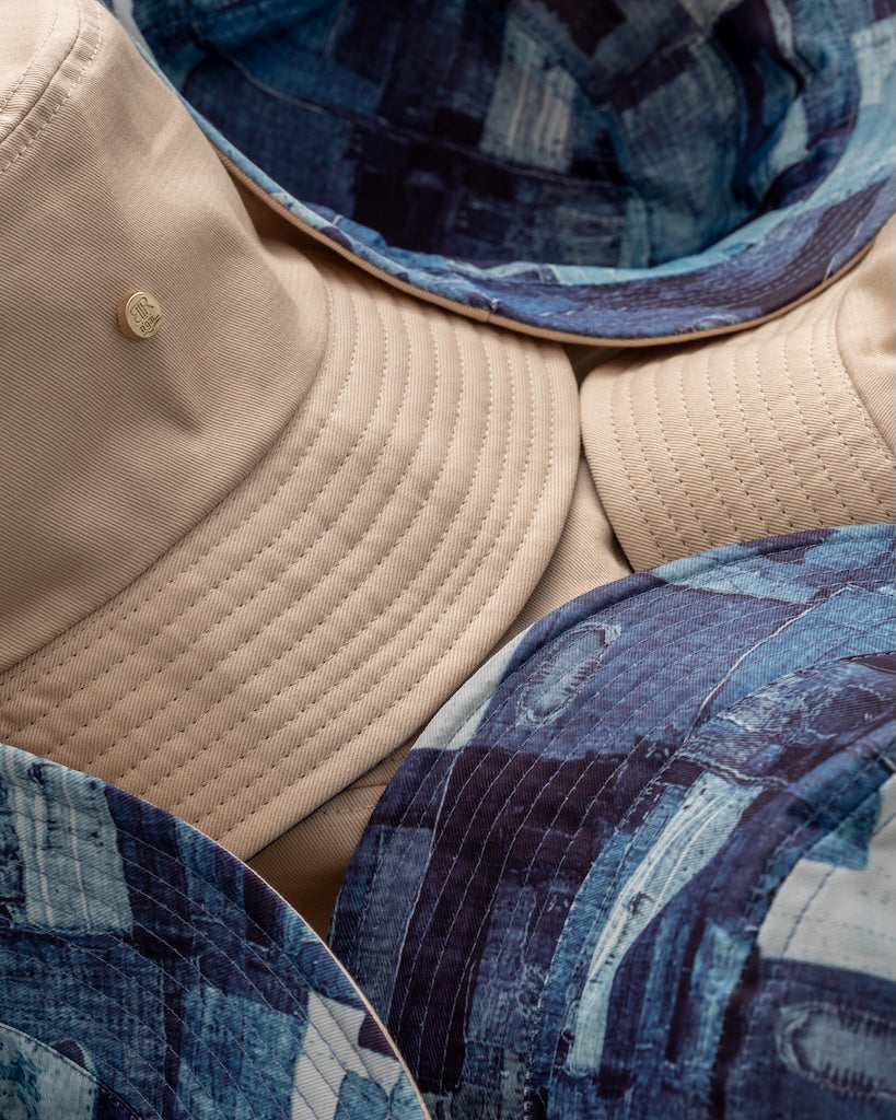 Meet The Kyoto, a reversible bucket hat that travels both worlds. Made in collaboration with N’gai Collective, this piece flips between a deep indigo pattern and a neutral tan tone—two distinct looks in one. Minimalist by design, it’s finished with gold hardware and no logos, keeping the focus on clean lines and versatility. Two sides, one statement.