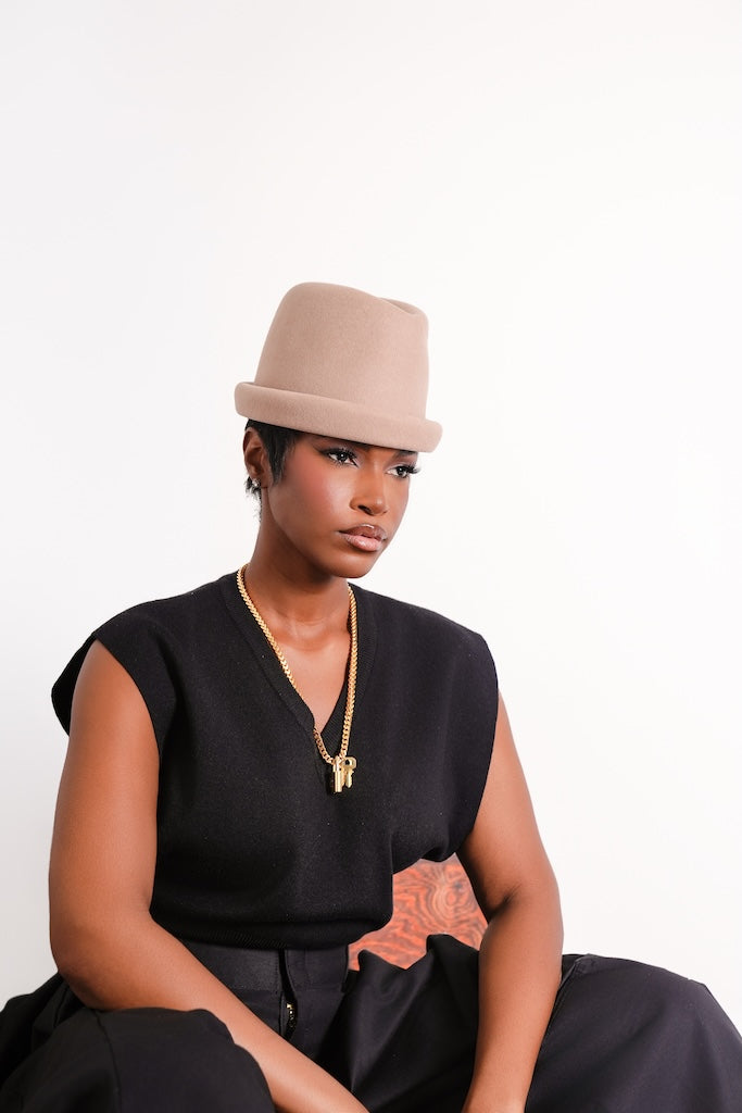 Crafted with luxe Australian wool and an impeccable structured form, the Russian Pillbox in Nude is a statement of subtle sophistication. Whether you style it with a dramatic upscale ensemble or minimalist tailoring for a refined contrast, this piece transforms any look into a work of art.
